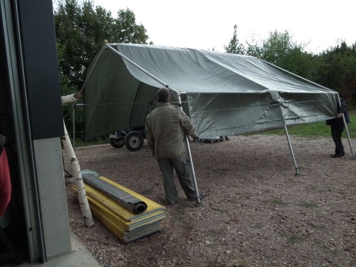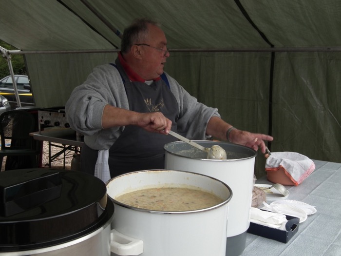 Am Freitag den 15. September dann ab 9.Uhr der Aufbau der Zelte und Stände und die vorbereitenden Arbeiten für die Speisen. Kartoffelpufferteig herstellen, Unmengen Zwiebeln schneiden und die Kartoffelsuppe vorkochen usw., also eine Menge an Arbeit ist zu tun.