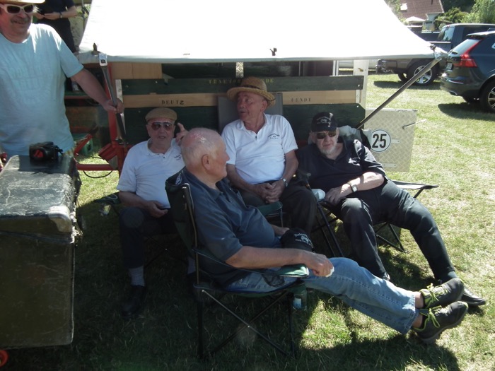 Dir Traktorfreunde hatten sich mit Sonnenschutz versehen bei ihren Traktoren aufgestellt und beobachteten das Spektakel.